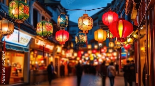 Chinese New Year Festivity: A Blurred China Town Backdrop with a Vibrant Lantern Festival bathed in a Spectrum of Colors.