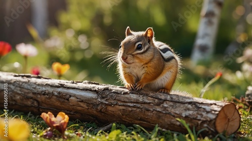Chipmunk sitting on a log in a sunny meadow