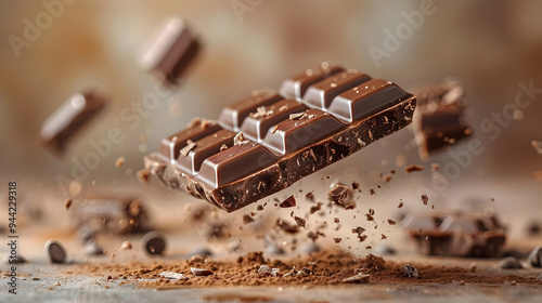 Chocolate Bar Falling on Cocoa Powder Realistic Image