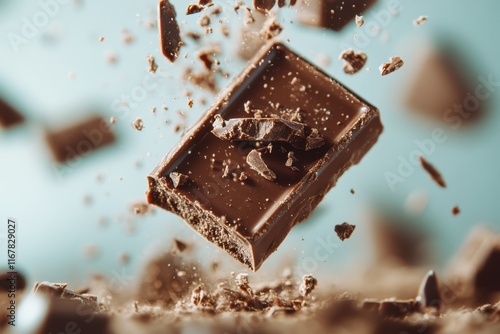 Chocolate bar floating amidst shards of cocoa, captured in a moment of delectable magic