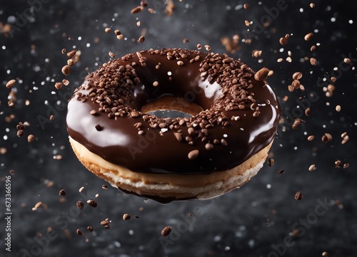 chocolate donut, dark marble background, exploding ingredients