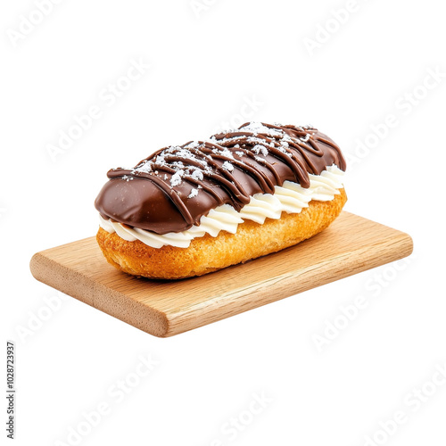 Chocolate éclair on a wooden tray, isolated on a white background, rustic and inviting. PNG