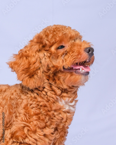chocolate fur color poodle dog photo shoot session on studio with gray color background and happy expression
