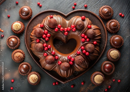 Chocolate heart shaped bundt cake covered by chocolate glaze and red sprinkles and chocolate truffles.
