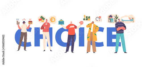 Choice Concept, Thoughtful People Characters Make Difficult Financial Decisions. Men and Women Face Dilemma, Solution