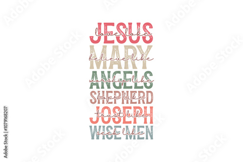 Christian Christmas SVG Typography T Shirt Design, Jesus Mary angels shepherd Joseph wise men