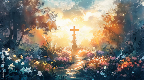 Christian cross in a magical forest landscape with flowers faith hope heaven god jesus christ religion belief