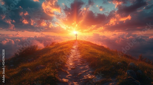 Christian Cross on Hilltop Pathway at Sunset - Easter Faith and Nature Landscape