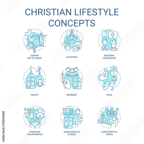 Christian lifestyle turquoise concept icons set. Culture of faith and religion. Worship idea thin line color illustrations. Isolated symbols. Editable stroke. Roboto-Medium, Myriad Pro-Bold fonts used