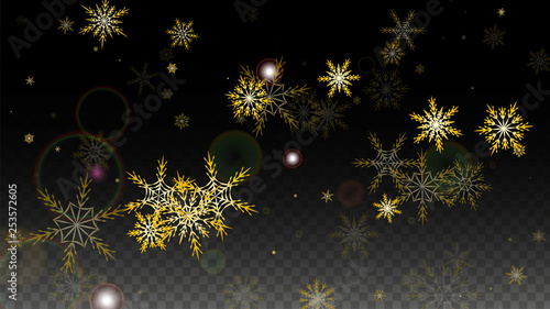 Christmas Vector Background with Gold Falling Snowflakes Isolated on Transparent Background. Realistic Snow Sparkle Pattern. Snowfall Overlay Print. Winter Sky. Design for Party Invitation.
