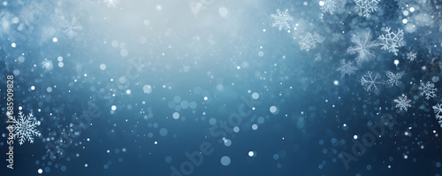 Christmas and New Year abstract blue background of falling snowflakes in a simple modern style. Minimalistic horizontal festive wallpaper with copy space for text. Design for card, poster, invitation,