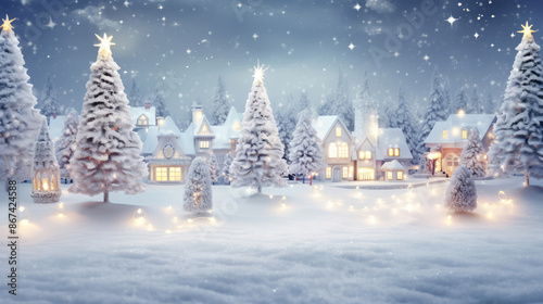 Christmas and New Year holidays background with Illuminated christmas tree, decorations on shining sparkling snowdrift. Christmas village, Winter festive composition., generative ai
