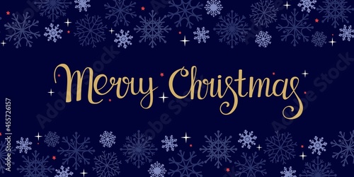 Christmas and New Year. Modern universal art templates. Christmas corporate greeting cards and invitations. Golden lettering on a dark blue background with snowflakes.