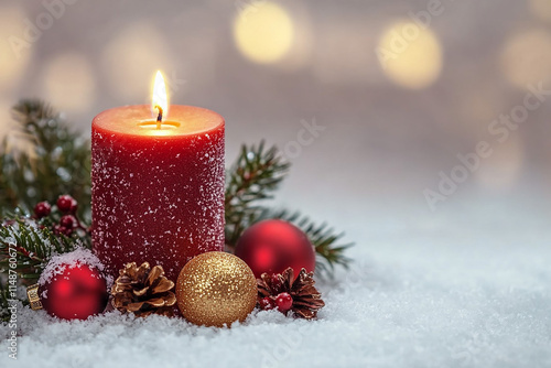 Christmas Background - Red Candle in winter snow landscape background - Blank greeting card with magic golden bokeh lights with copy space for your Xmas Advent greeting card