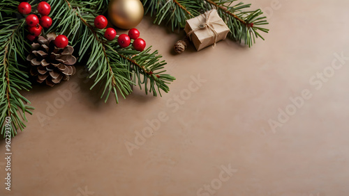 Christmas background with fir branches, cones and decorations. Copy space.