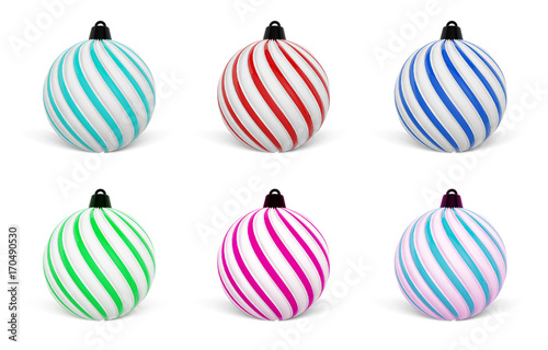 Christmas Ball in different colors. Twisted Christmas Balls on white background. 3D Rendering.