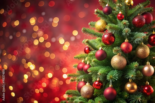 Christmas baubles hanging in a spiffy way on lush green branches of a fresh fir tree, with gold bokeh lights in the background