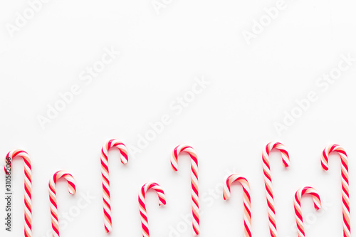 Christmas candies frame - cane with red and white stripes - on white background top-down copy space