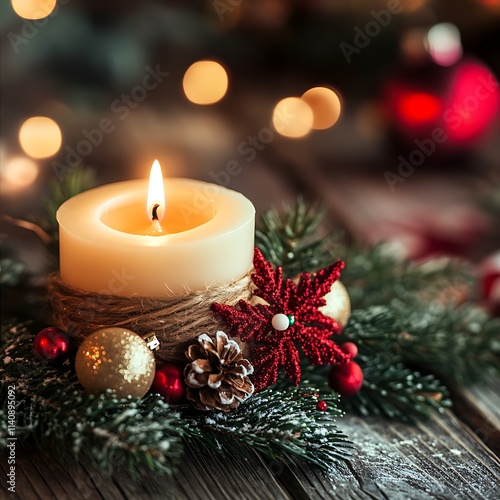 Christmas Candle Lit with Festive Ornaments and Greenery