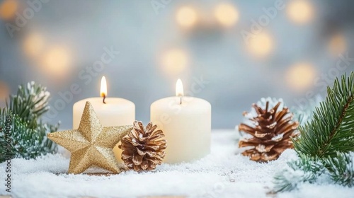 Christmas candles, pine cones, red berries, festive holiday decor.