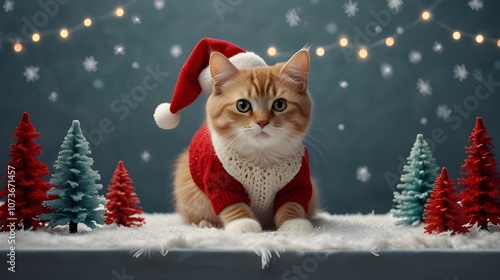 Christmas Cat in Santa Hat Sitting by Decorated Tree with Holiday Ornaments, A cat in a Santa Claus hat and a bow on his neck sits under the New Year's tree among New Year's gifts