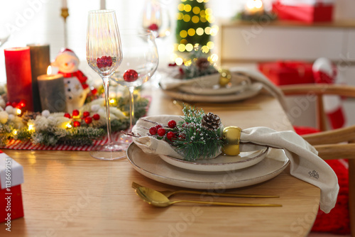 Christmas celebration. Festive table setting with dishware, glasses and decor in room