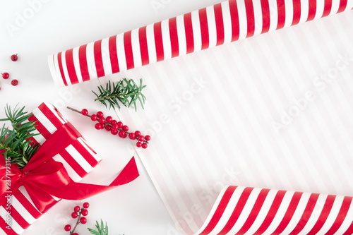 Christmas cozy composition. Xmas red gifts and decorations, paper on white background. Christmas, New Year, winter concept. Flat lay, top view, copy space