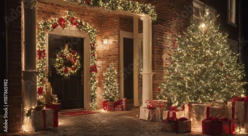 Christmas Decorated Brick House with Tree, Wreath, Lights, and Gifts Creating a Festive Atmosphere