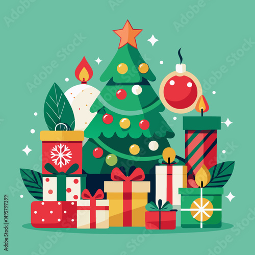Christmas decoration with christmas tree gift boxes red candles vector illustration