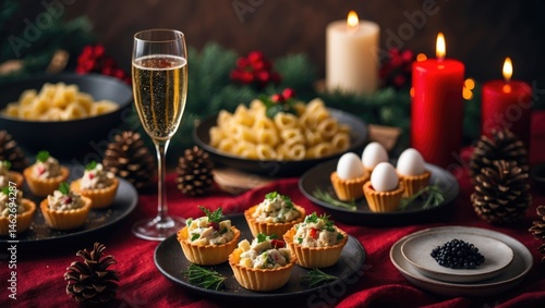 Christmas dinner setup with homemade dishes, a variety of appetizers including vol-au-vent and caviar canapes, champagne, candles, and holiday-themed decorations.