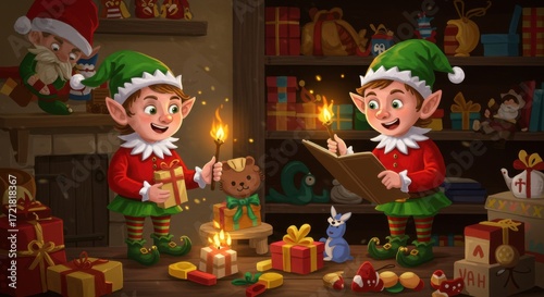 Christmas Elves Working in Santa's Magical Toy Workshop