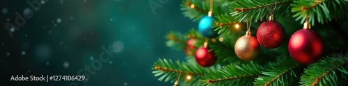 Christmas fir tree with colorful ornaments on the branch, colorful, garland, evergreen
