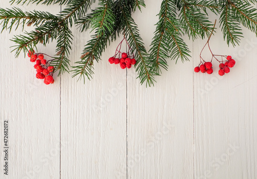 Christmas fir tree with natural berries as decoration on white wooden background with copy space