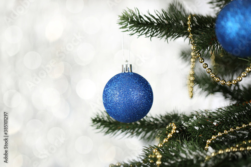 Christmas fir tree with ornaments on blurred lights background