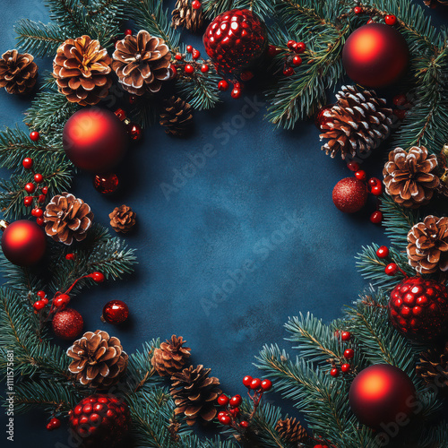 Christmas flat lay background with space in the center and decorations around it with festive atmosphere and small ornaments.