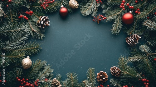 Christmas flatlay arrangement with festive greenery ornaments pinecones and red berries on dark background for holiday themed design