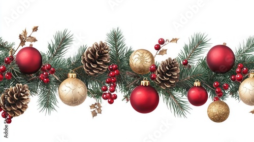 Christmas garland with red and gold baubles, berries, and pinecones on a white background.