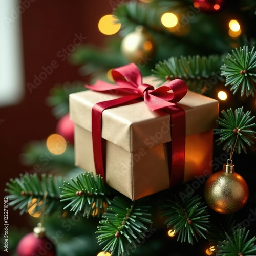 Christmas gift box on a decorated tree branch, christmas tree, box