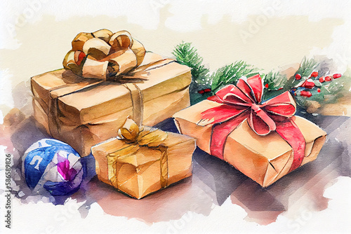 Christmas gift boxes decorated with lace and stars, lifestyle, holiday, gift. Generative Ai