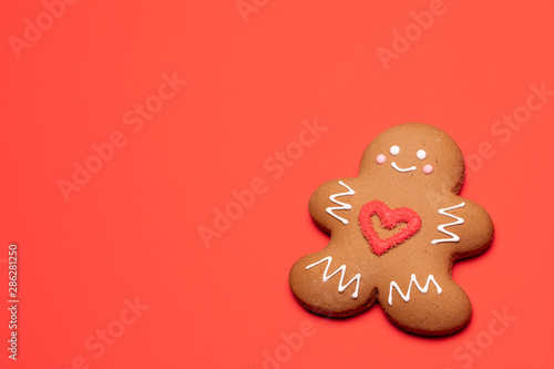 Christmas Gingerbread man biscuit with red heart icing on red background