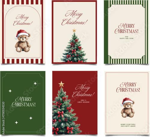 Christmas greeting card poster set. Design for season holidays, cover, poster.