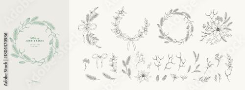 Christmas greeting wreaths, frame and vignettes with winter plants and traditional New year decorations for holiday card or invitation. Botanical set with engraving design