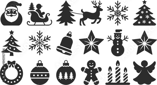 Christmas Holiday Black Vector Icons Set Santa Reindeer Tree and Winter Symbols