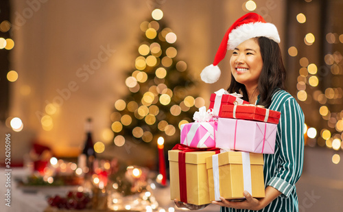 christmas, holidays and people concept - happy woman in santa hat with gift boxes over festive lights at home party background