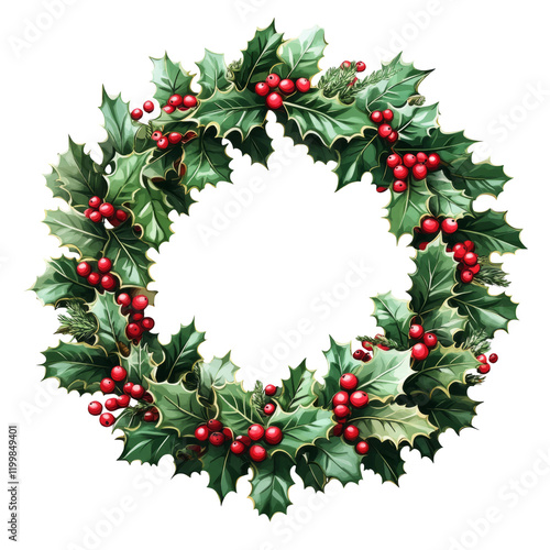 Christmas Holly Wreath with Red Berries Isolated on White Background