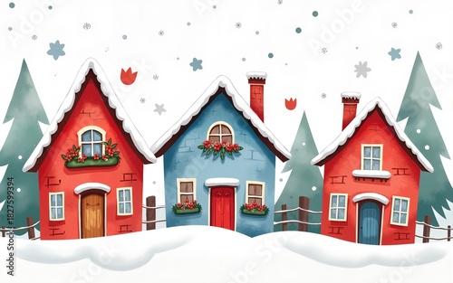 Christmas houses winter snow watercolor texture set clip art white red blue New Year holidays Thanksgiving 2026 2027 children template greeting card. High quality