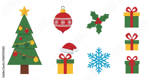 Christmas illustration set with tree, ornaments, gifts, and holiday decorations on white background with xmas and graphic design and green tree