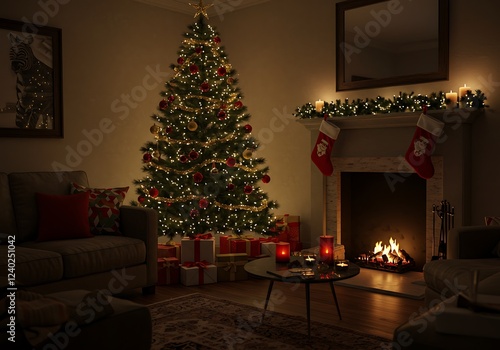 Christmas Living Room Festive Decor Fireplace Tree Presents