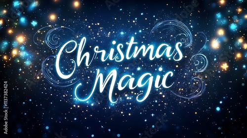 Christmas Magic in ethereal, glowing white text, sparkling light trails forming whimsical swirls, twilight blue background with scattered starry lights and a serene winter vibe. --ar 16:9