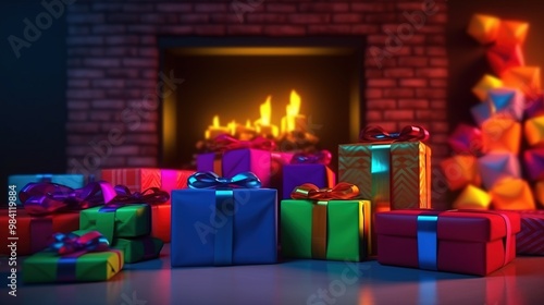 Christmas New Year gift boxes with ribbon in decorated interior, blazing fireplace background. AI generated.